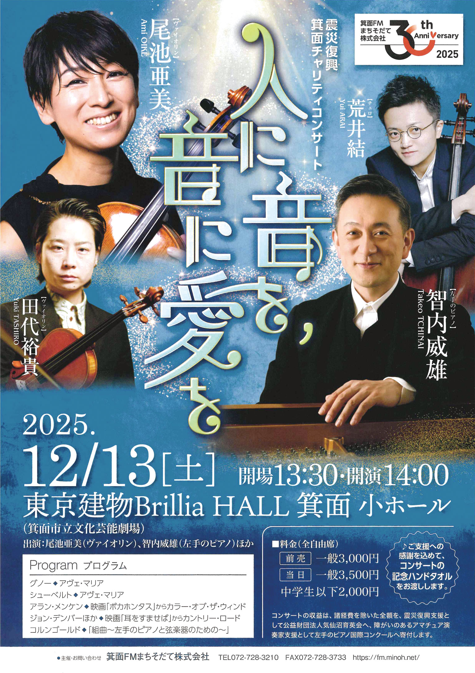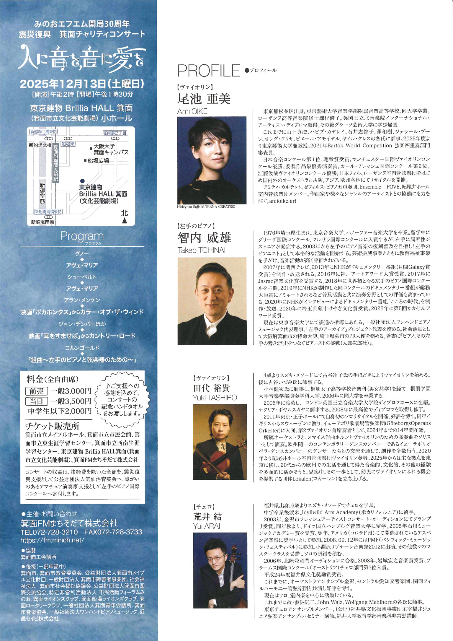 出演:尾池亜美(ヴァイオリン)、智内威雄(左手のピアノ)、田代裕貴(ヴァイオリン)、荒井結(チェロ)