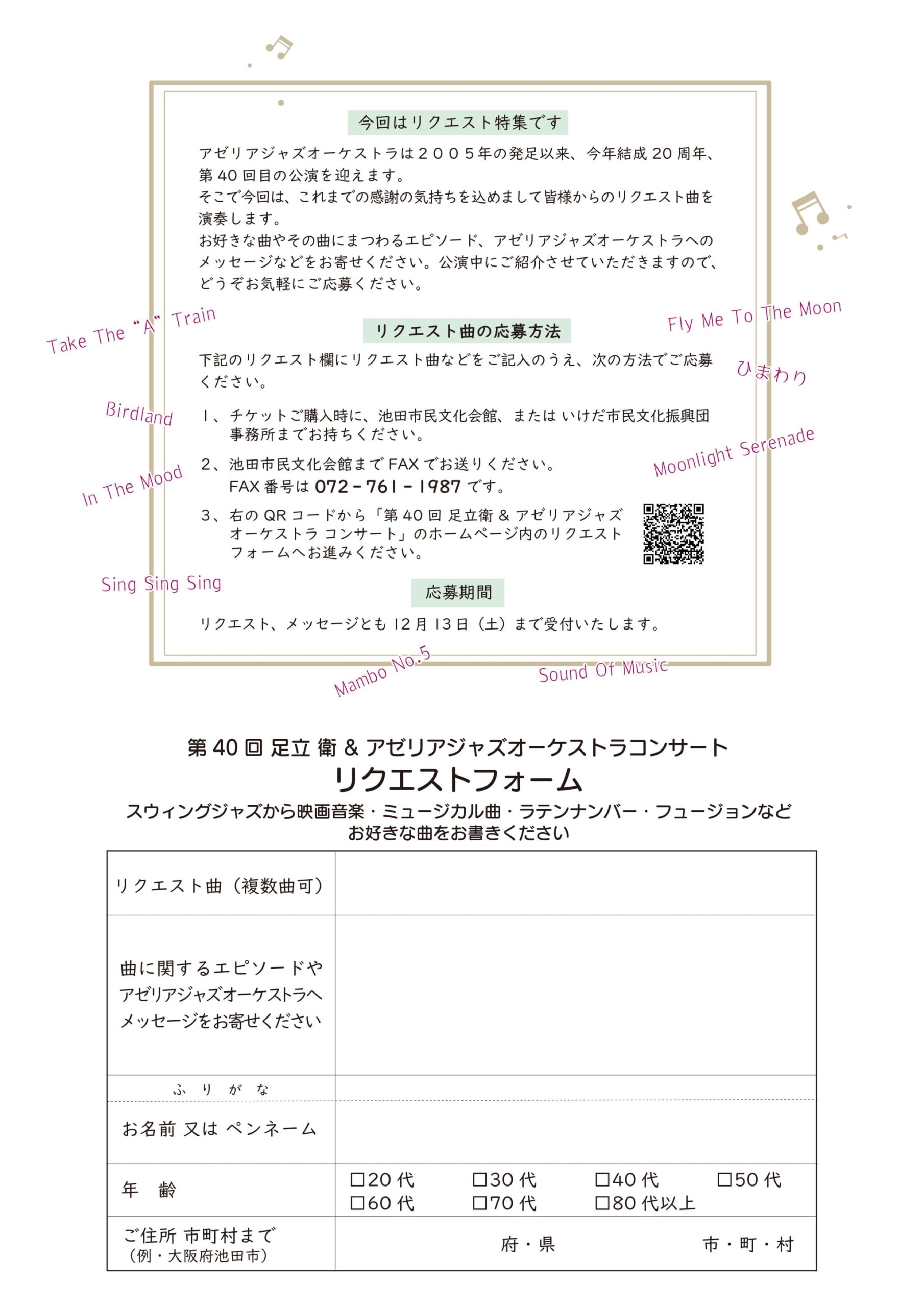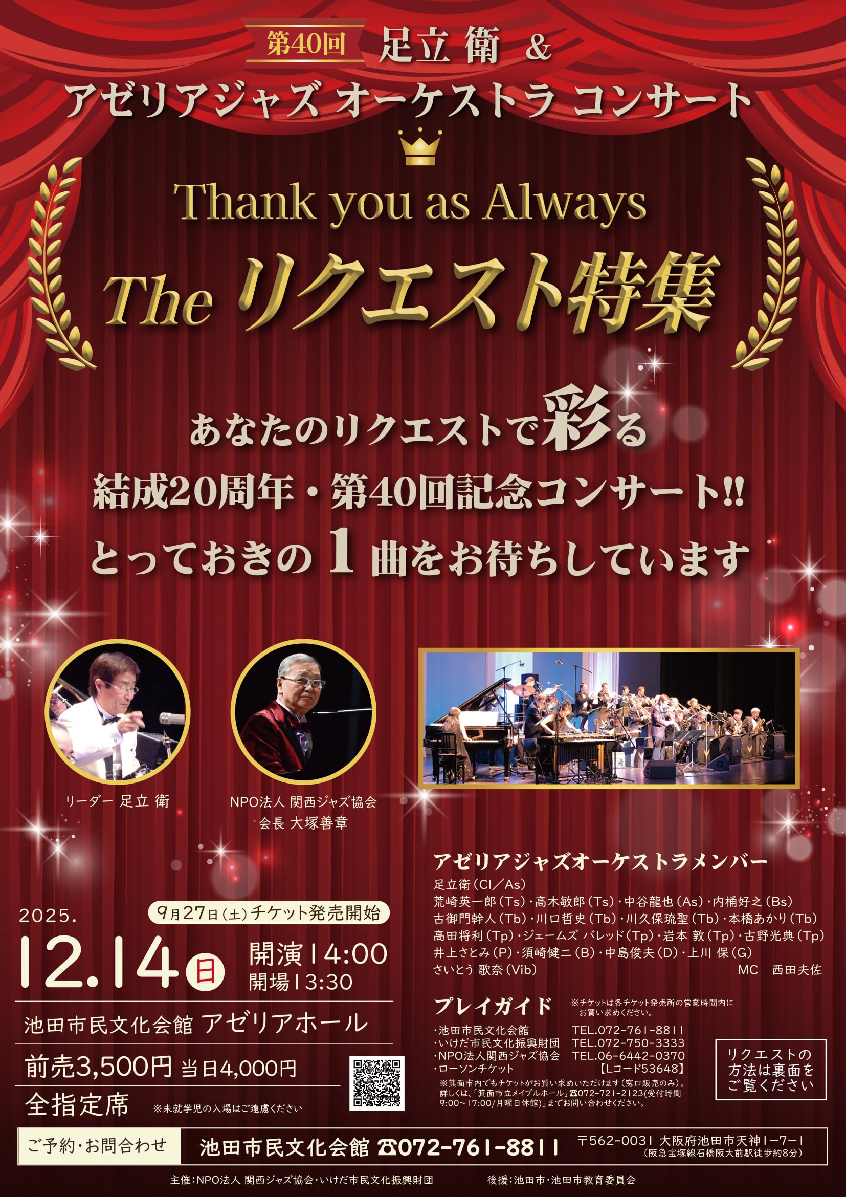 *詳しくは、いけだ市民文化振興財団ホームページをご覧ください→「第40回 足立衛&アゼリアジャズオーケストラ コンサート Thank you as Always The リクエスト特集」についてはコチラをクリック