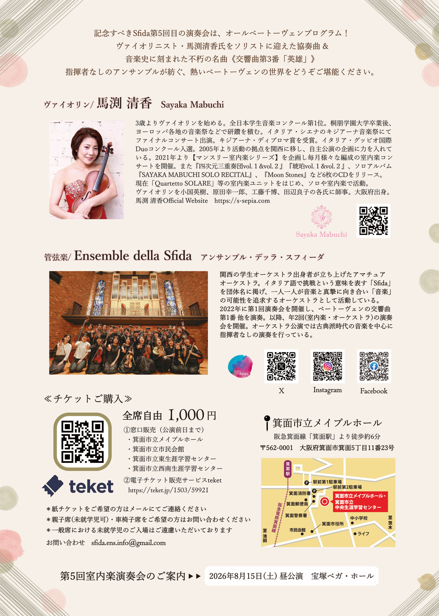※チケットは箕面市内4か所の施設(メイプルホール、市民会館、東生涯学習センター、西南生涯学習センター)の窓口でもご購入いただけます(予約・取り置き不可)。