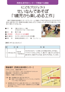 11月13日(木)10:00~11:30 子どもたちがシールを貼ったりお絵かきをした作品に、ママやパパが仕上げをして、親子で一緒に作った作品で遊びます。 手遊びやふれあいあそびも予定しています。 |