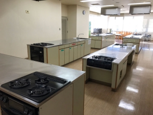 | 備品 | 調理台5台(内障害のあるかた用1台)、椅子24脚 オーブン4台・ガスコンベック2台・ミキサーなど調理器具 |