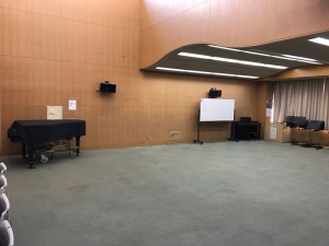 | 備品 | テーブル2台、椅子52脚 ホワイトボード2台、譜面台・指揮台グランドピアノ・ドラム・弦バス・ティンパニー・シンバルなど貸出可能 |
